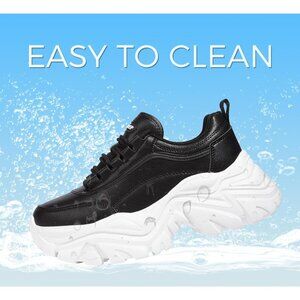 Women's Black/White Chunky Rubber Platform Casual Lace-Up Walking Sneaker Shoes