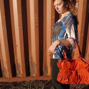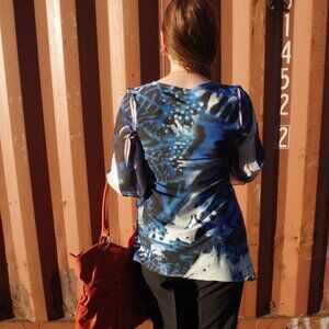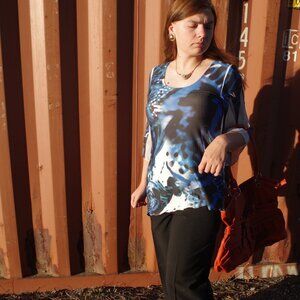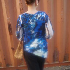 Blue and black blouse by Pretty Women, size small, made out of 92% polyester,8%spandex.The size small, has shear arms. high in front low in back. In good condition .Pit to pit 16 1/2 inches across.