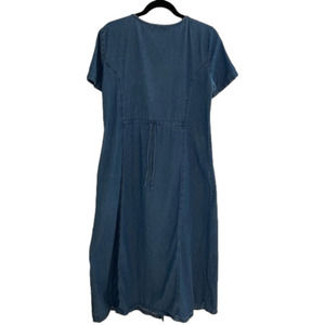 This elegant blue denim maxi dress features delicate embroidery, perfect for casual outings or a day at the park. Enjoy the comfort and style of this versatile piece.