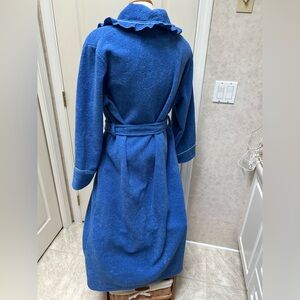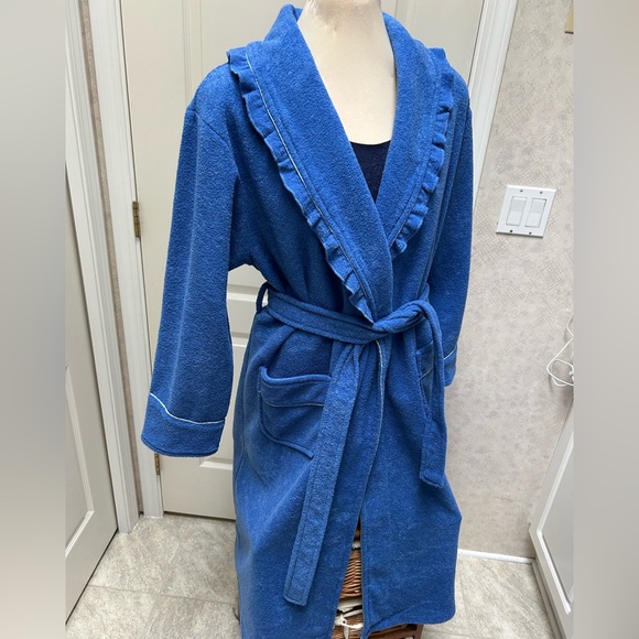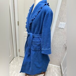 Stay cozy and stylish with this blue ruffled belted robe. Perfect for adding a touch of elegance to your at-home wardrobe. Also the cotton blend fabric is more comfy than fleece. Size M but fits L/XL.
