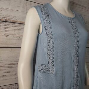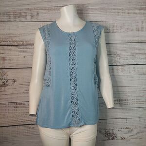 Elegant blue sleeveless top with delicate lace detailing. Perfect for casual outings or a day at the office.