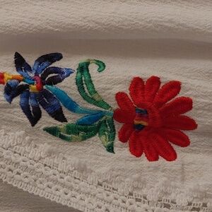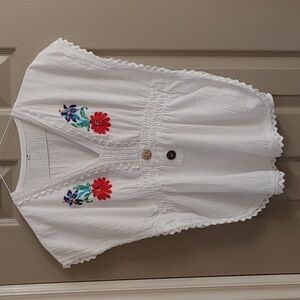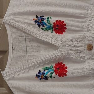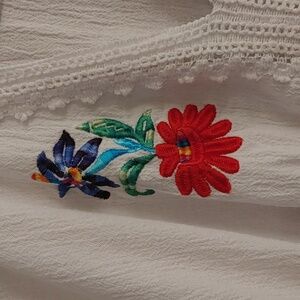 Women's Bohemian White Cotton Top With Crochet Trim & Embroidered Flowers Medium