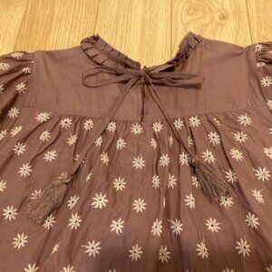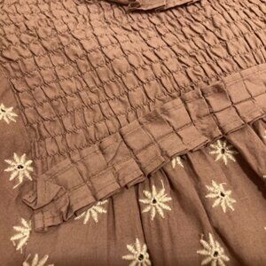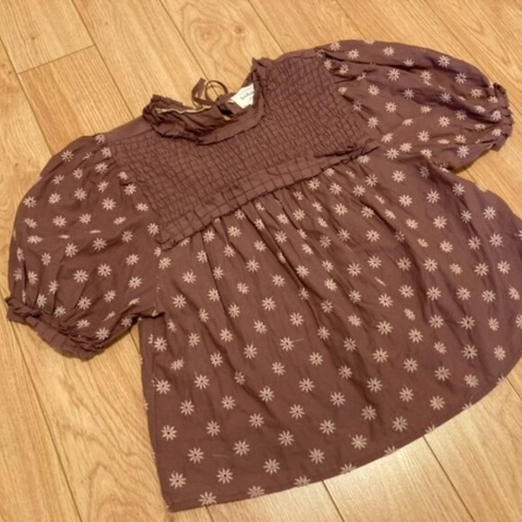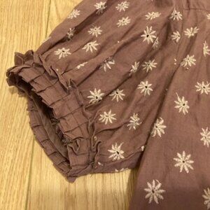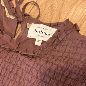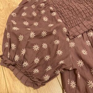 This is the cutest bohme boho style babydoll short sleeve top in XS. The top is babydoll style so it runs a bit bigger even though it's an XS. It has beautiful ruffled details and a pretty brown reddish color with a cute print. It has a slightly shorter fit as it's meant to look like a babydoll style top. It's in perfect condition as it was only worn twice.