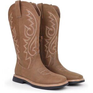 Women's Brown Embroidered Square Toe Side Zipper Western Mid Calf Dress Boots