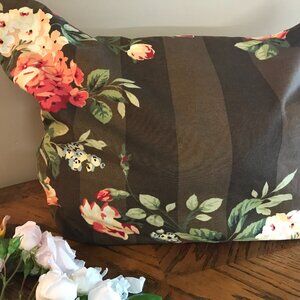 Beautiful Rose and Pink Floral print on a brown striped background. It has a dark brown cotton fabric for the lining.