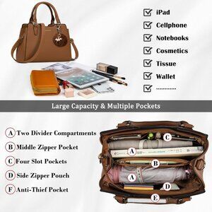 Spacious Capacity & Multiple Pockets: Our handbags are roomy enough which can satisfy all your daily essentials. The handbag includes three compartments, one middle pocket, one compartment with zipper pouch and the other with four slots. And there is an outer zipper pocket on the back of the purse. The huge capacity of the handbags women accommodates your wallet, ipad, books, cosmetics, etc. The dimension of the bag is 12*8.5*5.5 inch that is excellent for women to carry with gorgeousness