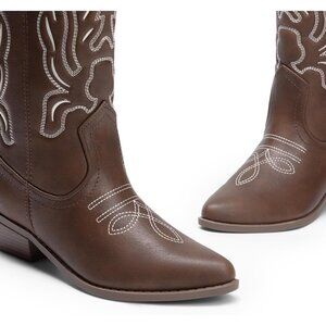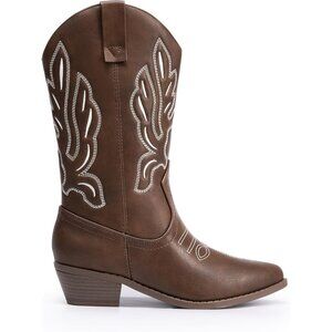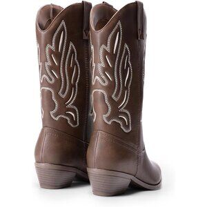 Women's Brown-PU Mid Calf Western Embroidery Stitched Faux Leather Cowgirl Boots