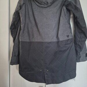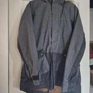 Women's Burton snowboard jacket with snow skirt. Has removable fur hood and removable snow skirt.