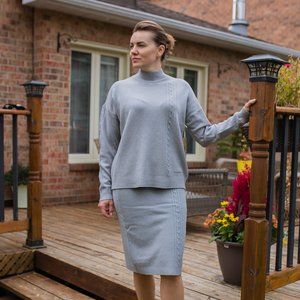 Women's Business Style two-piece outfit (warm midi skirt and top) made of wool - 75%, cashmere - 10% and spendex - 15%. Available in six colours: light and dark grey, black, dark blue, denim and camel.