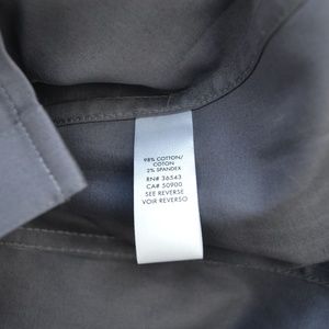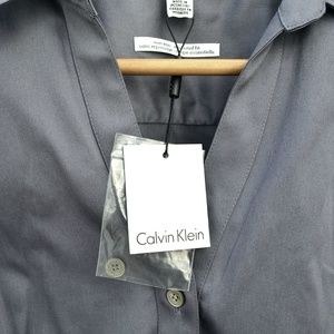 Very pretty button down shirt. Nice shade of grey. Sizes size medium but fits more like a small. Measurements (laid flat) armhole to armhole (bust) 17 in. length of shirt is 26 in. sleeve length is 23 in. Brand: CALVIN KLEIN. Material: 98% cotton, 2% spandex. Never worn. Great condition.