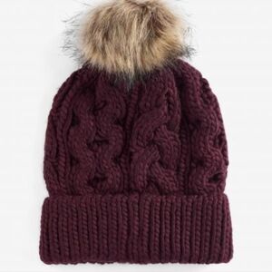 Women's Cable Knit Faux Fur Pom Bobble Hat in the Classical Bordeaux OS. New without tags