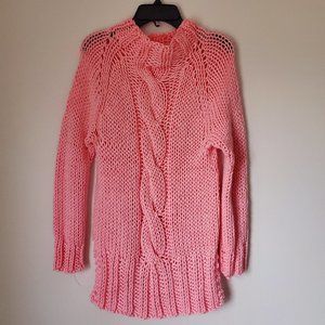 Women's Candy Pink Thick Chunky Cable Knit Pullover Sweater Handmade Hi Lo Hem