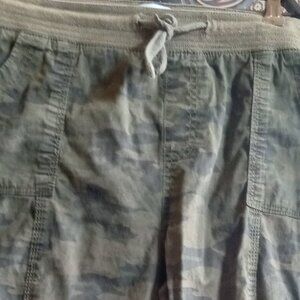 Pro loved woems army print capris. Has pockets on both sides at the waiste as well as half way down the pant leg there are button up pockets on both side allowing more space for personal items. These capris were well taken care of. No rips tears or stains.