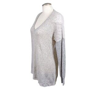 This is a women's size medium gray cashmere sweater by Raffi. It features an open-knit design with mixed knits, long sleeves, and a round neckline. The pullover style sweater is lightweight, super soft, and perfect for winter, fall, and spring. Ideal for travel, casual, or workwear occasions, this classic fit sweater embodies an artsy, minimalist, coastal, contemporary, quiet luxury, boho, and cozy style.