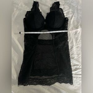 Washed twice & worn once for a photo shoot. Pink tags had to be cut off for the event & no longer have record of size. Gently used condition. Purchased with my other listing (different colour) entitled “Chemise- Size Large” Although not confirmed, best guess is - Size Large from La Vie En Rose. Light pink tags remnant for La Vie material tag pictured in last photo. Please only purchase if you are accepting of these details/lack of confirmed info to prevent a discrepancy concern upon receipt of the item. Refer to photos 3-5 with measuring tape for sizing visual. Features stretchy bottom hem. Several creases in both padding areas as well. Please reach out if additional photos or measurements are required