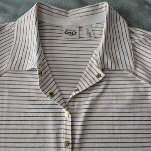 Gorgeous striped golf shirt by Chico's - white / off white shirt with gold glitter stripes.