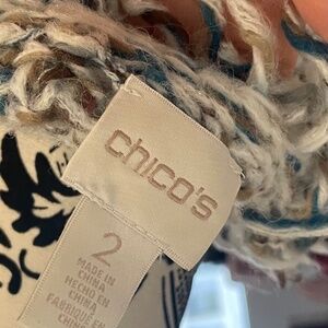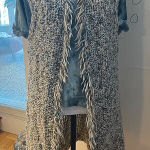 Cool boho style sleeveless sweater/long vest with fringe and gorgeous blue/green/brown colours. Chicos size 2 (which is a M-L) but fits me (S) as oversized. Excellent condition. Length is 38" to bottom. Will ship UPS if ordered by Dec 3 or pickup available in Toronto to.