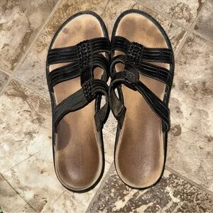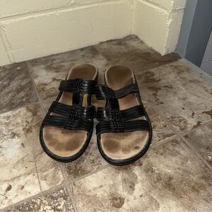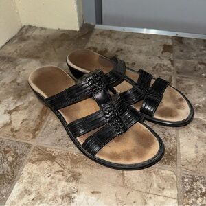 Stylish black strappy sandals. Perfect for casual wear. In preowned condition as you can tell from photos. Still had plenty of life in them. The bottoms have very little wear and the leather is still is great shape. Pretty small platform rise. No box. Will be shipped in a poly mailer unless otherwise stated.
