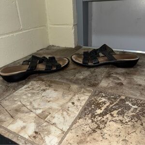 Women’s Clark’s Brand Black Real Leather Strappy Sandals Shoes Size 11/12