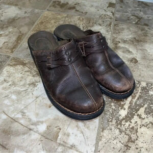 Womens Clark’s brown leather slip on brown clogs shoes. Size 6. In worn condition. Faded leather on the front and bottoms show signs of wear. Still can be worn. Condition reflects price. Very comfortable.