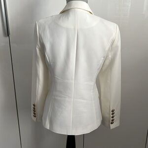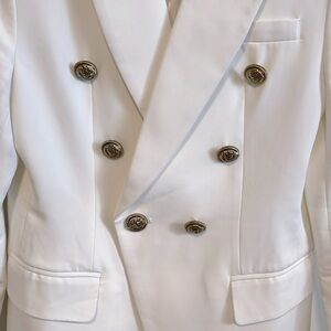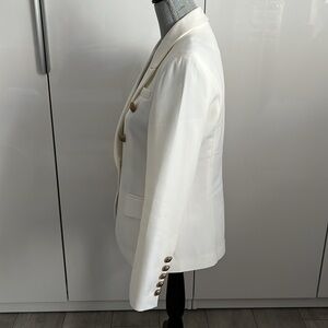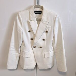 A classic Balmain style blazer with gold buttons. Tailored style tapered at waist, shoulder pads, 2 front pockets in ivory with gold button detail. Excellent quality medium weight fabric and fully lined. Cotton Polyester blend. Excellent condition. Size XL fits small.