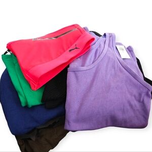 Two pieces are brand new with tags and the rest are in excellent condition! Two long sleeve Athleta dresses (purple and black and grey camo), a orangey pink Puma sports bra, bright green H&M short sleeve dress, green khaki cargo pants from H&M that are like new! Brand New with tags black heavy knit long sleeve Cardigan from old Navy, and a purple tank top that's also brand new with tags! Can't go wrong!