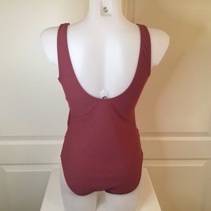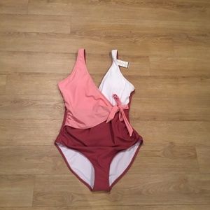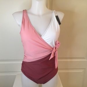 Brand new Summer Mae women’s size L (size chart above) coloured blocked one piece bathing suit. Wide straps with V neck and removable padded bra. Modest brief bottom. Attached side waist belt tie.