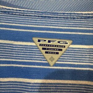 Features: blue and white stripes UPF 50 sun protection, pockets, and mesh trim detailing.