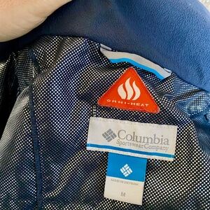 Blue Columbia Omni-heat shell jacket. Womens size medium. Zippered pockets on the front. Inside zippered pocket for something small like a credit card or your phone. Water resistant and has a hood that can be removed. The silver lining reflects your body heat and keeps you warm. Not a winter jacket but suitable for fall, or spring weather. Not heavy or bulky, was used for skiing.