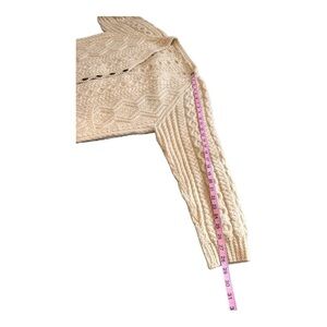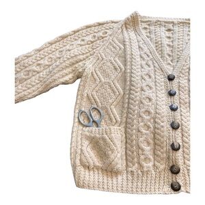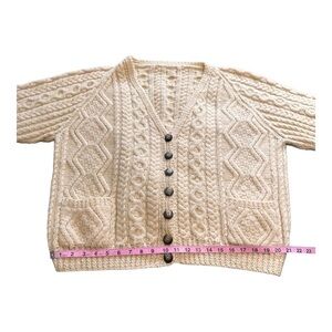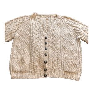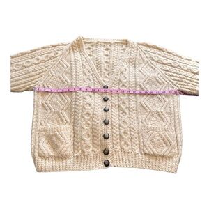 Stay cozy and stylish with this elegant cream cable knit cardigan. Perfect for layering, this sweater adds a touch of warmth and sophistication to any outfit.