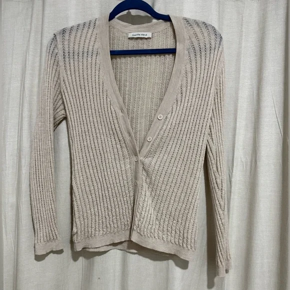 Soft cream ribbed cardigan from . Lightweight knit with a flattering V-neck and button front. Comfortable long sleeves and versatile cream color for everyday wear. Easy to layer for casual or dressy looks.