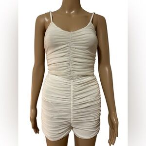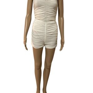 Elegant cream bodysuit with ruched detailing. Perfect for a comfortable and stylish look.