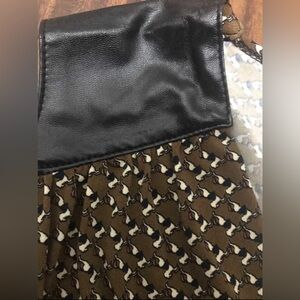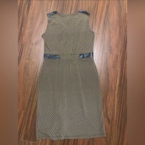 Like new! Brown/black/cream print dress with faux leather blocking/panels on shoulders and waist. Pull-on style. Fabric has a bit of stretch.