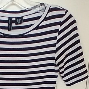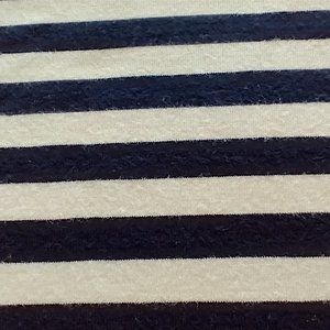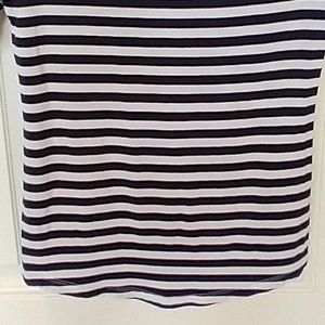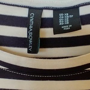 Women's Cynthia Rowley size XS casual short-sleeve striped shirt. Stripes are white and dark navy blue (almost black). Previously worn - great condition. No stains or marks. Fabric description / cleaning instructions tag was cut out - recommend washing in cold water on gentle/delicate cycle. Length from neck opening to hem = 20.75". Length from neck opening along top of shoulder to sleeve = 11.5". Length from armpit to sleeve = 5.5".