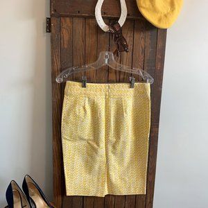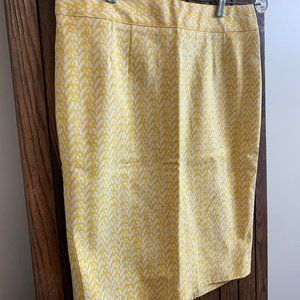 This is the perfect spring and summer skirt. Beautiful mustard yellow and white design pencil skirt, size 2. Has hidden zipper and the back and button closure. Made of 97% cotton and 3% spandex. In excellent used condition from smoke free home.