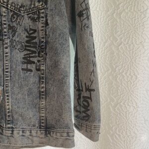 Discover edgy style with the Women's Distressed Denim Jacket. This blue and black jacket features unique distressed details and bold graphics, perfect for making a statement.
