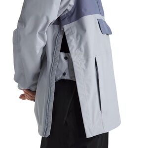 The Women’s Driftview Anorak uses a waterproof, seam-sealed DryVent™ fabric and an attached, helmet-compatible hood for full on-mountain coverage. Stacked kangaroo pockets provide on-the-go storage, and the side entry design makes it easy to remove when back at the lodge.