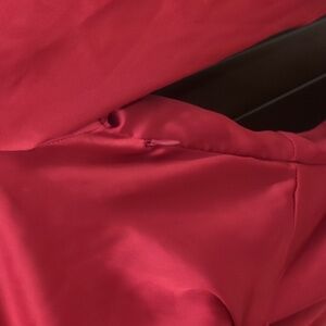 Chic deep red satin dress with a wrap design and side rouching. Features long sleeves and a flattering fit, side zip. Tag says XXS but would fit a XS