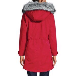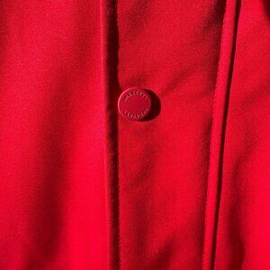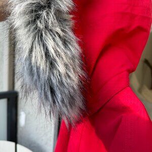 Vibrant red, size small ( US 6 to 8 ), stunning condition. Several pockets, drawstring waist option, detachable fur, detachable hood, waterproof, down insulation.