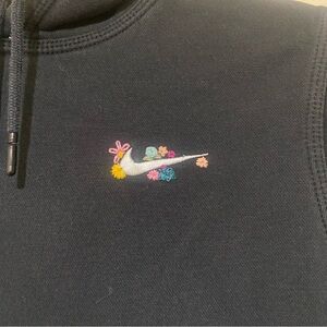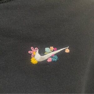 Women’s Faded black Nike hoodie with embroidered floral details. Size small. Can’t find this exact hoodie which leads me to believe the embroidery was added on and homemade. Hoodie is slightly faded black as seen in the photos. No other issues or flaws. still in great condition.