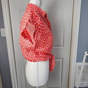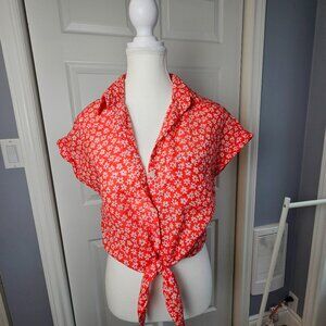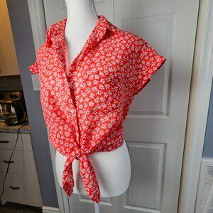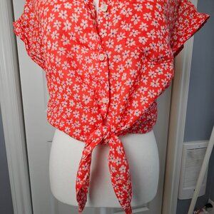 Women's Floral blouse- Collared- White and orange Color- Dropped short Sleeve.