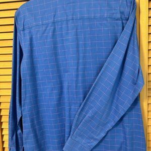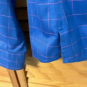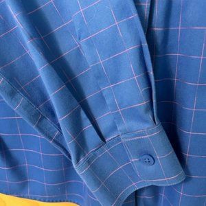 Absolutely stunning vibrant blue blouse with pink accent lines. 100% Cotton and it is easy care - wash and dry and wrinkle free. Long sleeves with buttoned cuffs. Y neck with point collar. Side vents. The picture of the side vents actually captures the correct color of the blouse. The other pix are ok - best I could do - but that side vent pix is perfect.  Never worn. Took the tags off and washed it. Put it in the closet and promptly lost it!!  Have wondered from time to time what happened to it but then forgot about it...... and  today I found it ..... which is your lucky day!!