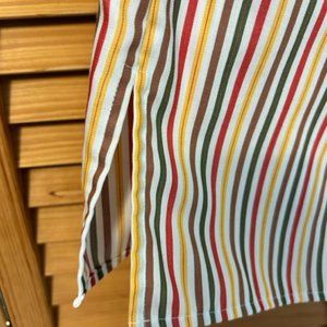 Beautiful multi striped womens Foxcroft blouse. Totally wrinkle free and no maintenance - wash and dry - no iron. Y neck and point collar. Side vents, long sleeves with button cuffs. Great fall colors! Worn twice. My coloring doesnt work at all with this blouse but I loved the look and feel of it - so once again ... another impulse buy! Impeccable shape and steal of a deal for a great label known for quality.