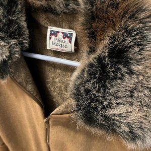 Beige zip up pea coat made in Canada. Size small with faux-fur collar. Good condition.