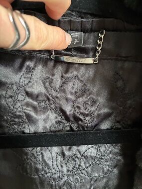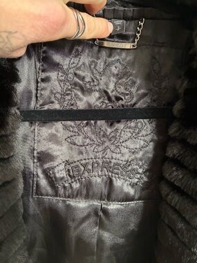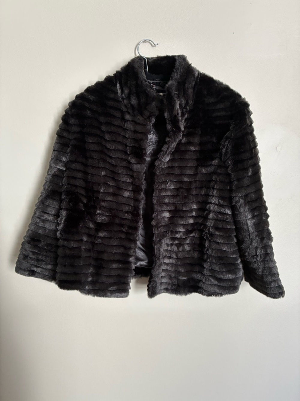 Luxurious black fur jacket with a ribbed texture. Soft, plush fabric delivers cozy warmth and refined style. Easy to layer for evening or casual looks. Classic collar and open front for effortless wear. Shorter arms