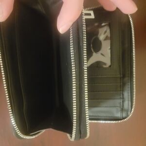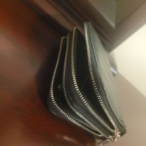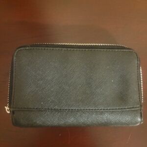 Stylish black zip wallet by GUESS. Features a sleek design with gold logo detailing.