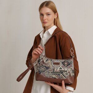 Elegant Tapestry & Leather Blend: This Sling Hobo Shoulder Bag is Made from premium tapestry fabric with genuine leather trims and a stylish chain strap with a leather grip, offered in Vintage, Geometric, Botanical, Floral & Abstract Designs.