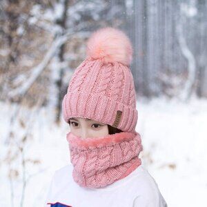 Womens Girls Winter Knit Beanie Hat and Scarf Set Warm Pom Pom Ski Set