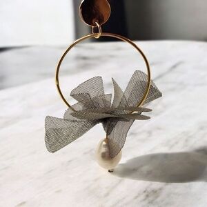 Enhance your style with these chic hoop earrings featuring a delicate gray fabric flower and a lustrous pearl accent, set in a gold-tone finish. Perfect for any occasion.