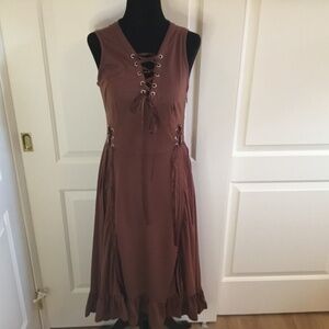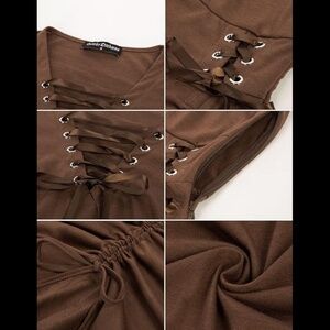 Brand new condition without tags SCARLET DARKNESS women’s size S (size chart in photos) brown Goth lace up vintage style dress. Vintage style sleeveless dress with drawstring, Victorian style ruffles and adjustable high low hem. Has a side zipper. 82%Polyester, 15%Cotton, 3%Elastane